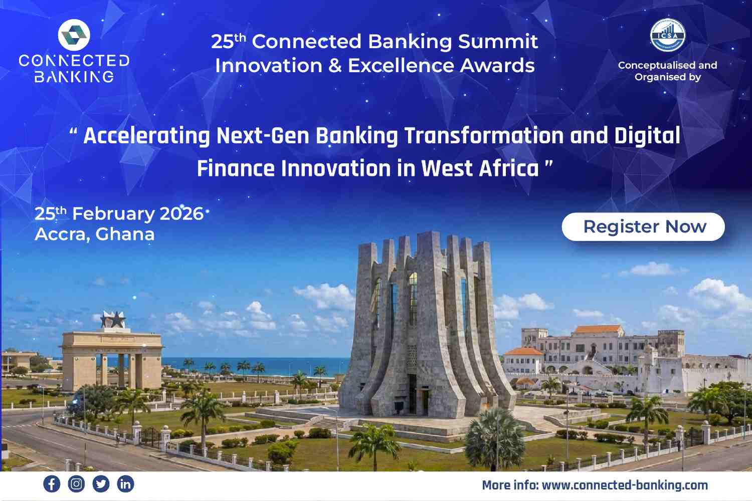Accra, Ghana – The International Centre for Strategic Alliances (ICSA) proudly announces the 25th Edition Connected Banking Summit – Innovation & Excellence Awards 2026, taking place on 25th February 2026 in Accra, Ghana.